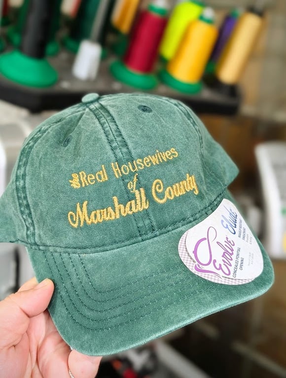 A hand holds a green cap embroidered with "Real Housewives of Marshall County" against a backdrop of colorful sewing thread spools.