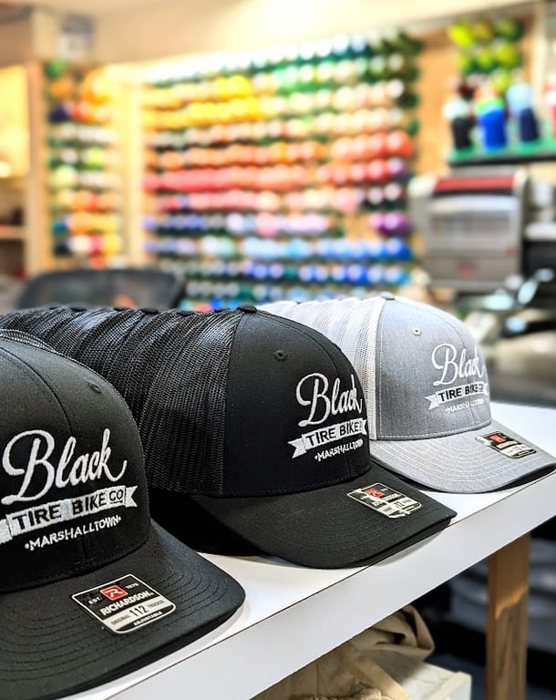 The image features a display of stylish caps in black and gray, showcasing the "Black Tire Bike Co." logo.