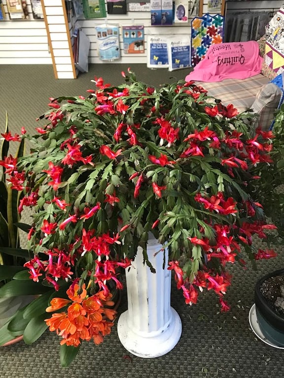A vibrant display of red flowers in a white planter is featured prominently in the sewing store.