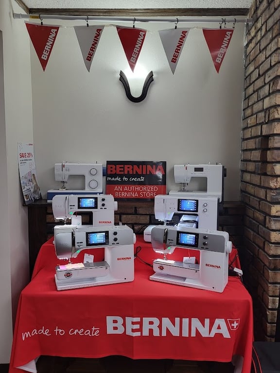 The image showcases a display of Bernina sewing machines at Redfield Quilt Shop, featuring a vibrant red tablecloth with the brand name.