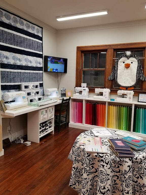 The image shows the interior of It's Sew Tempting, featuring sewing machines on a table, colorful fabric rolls on shelves, and a whimsical penguin display.