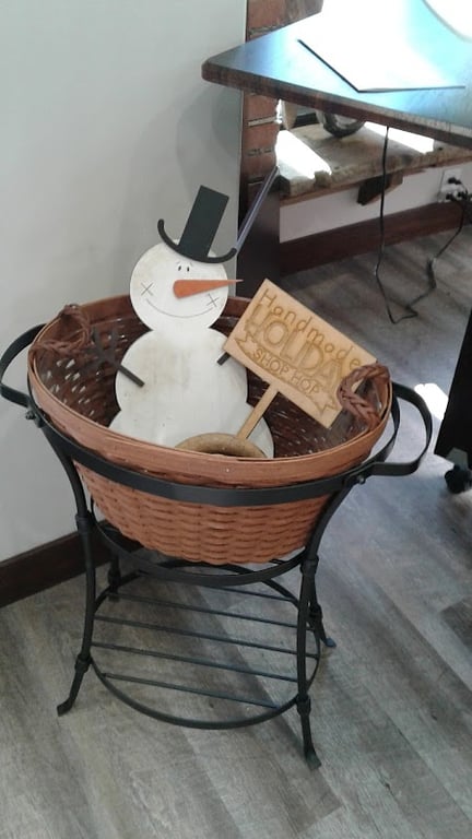 A decorative basket stands in the sewing store, featuring a cheerful wooden snowman and a sign that reads "Handmade Holiday Shop.