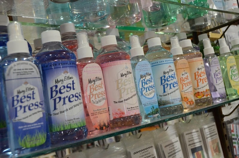 The image showcases a colorful display of Mary Ellen's Best Press fabric spray starch bottles arranged on a shelf in Cotton Creek Mill.