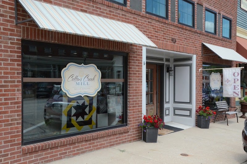 The image shows the exterior of Cotton Creek Mill, a sewing store with a welcoming entrance.