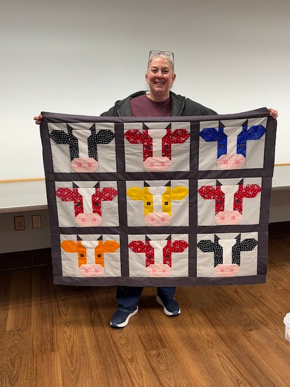 A smiling woman holds a colorful quilt featuring cow designs, showcasing her sewing skills. The setting is a well-lit interior, emphasizing creativity and community in quilting.