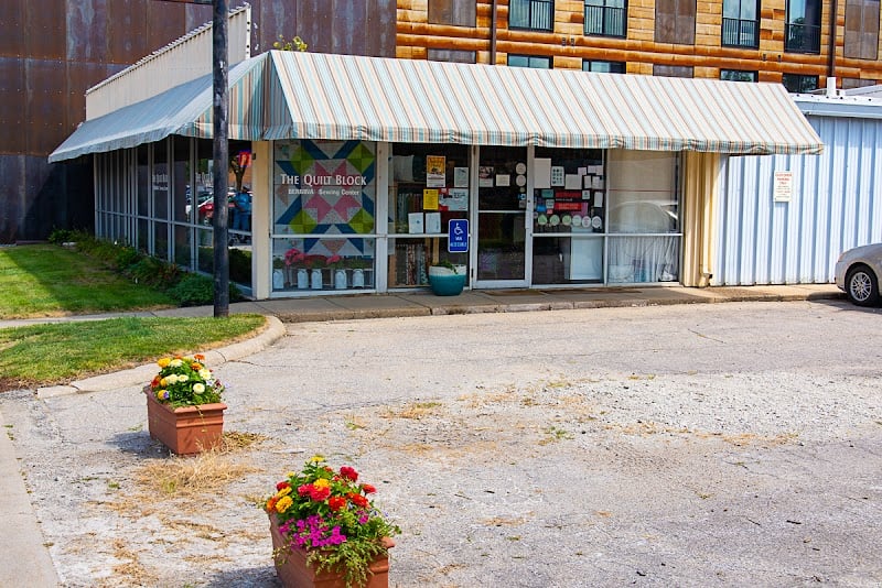 The Iowa Quilt Block is a charming sewing store featuring a colorful awning and large windows displaying various fabrics and quilting supplies.