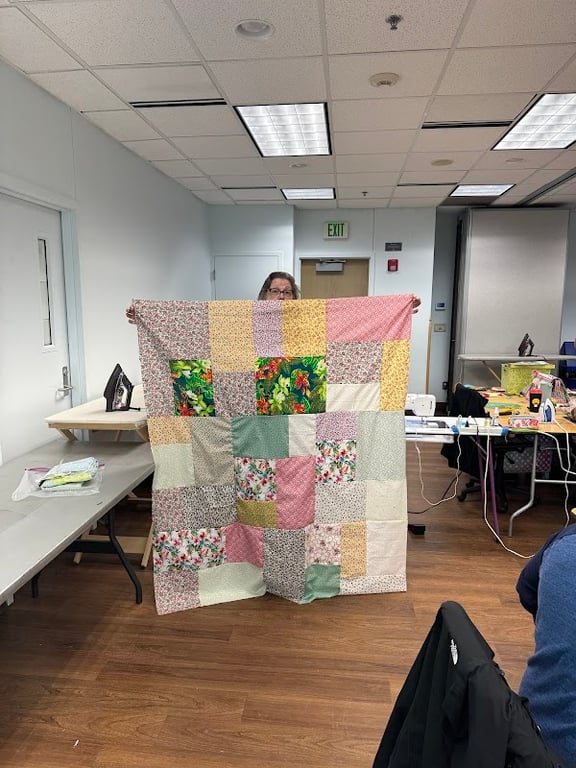 A person holds up a colorful quilt featuring sewing machine motifs, showcasing various fabrics.