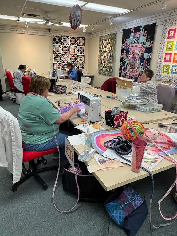 The image shows a vibrant sewing studio at The Iowa Quilt Block, featuring several people working on sewing machines.
