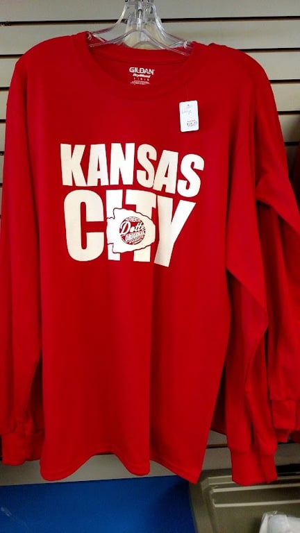 A vibrant red long-sleeve shirt featuring "KANSAS CITY" in bold white letters hangs on a display.