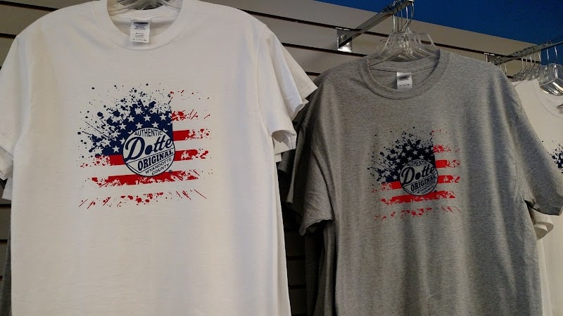 The image features two T-shirts displayed on hangers, one white and one gray, both adorned with a festive "4th of July in the Dotte" design featuring colorful fireworks.