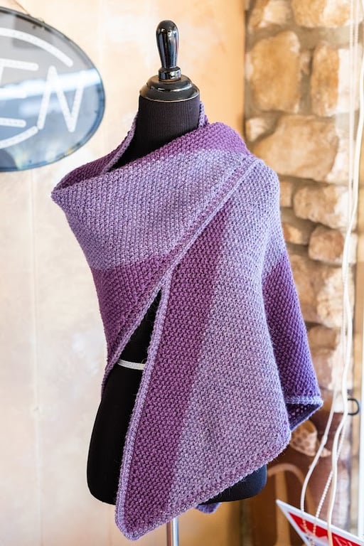 A purple gradient shawl is displayed on a dress form in Sue's Ultimate Embroidery sewing store.
