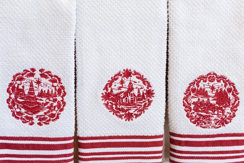 The image features three white kitchen towels adorned with intricate red embroidery depicting festive scenes. Each towel has a striped red border, enhancing its decorative appeal.