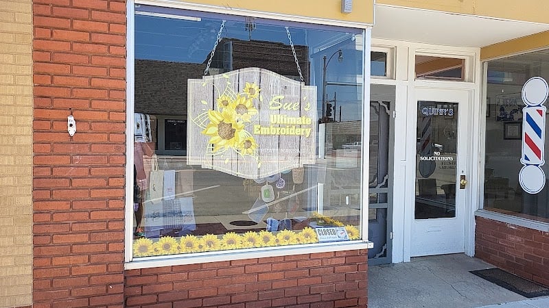 The image shows the storefront of Sue's Ultimate Embroidery, featuring a bright window display adorned with sunflowers and sewing supplies.