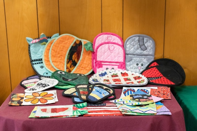 The image showcases a vibrant display of quilted items at Sue's Ultimate Embroidery, including colorful pot holders and decorative fabric pieces.