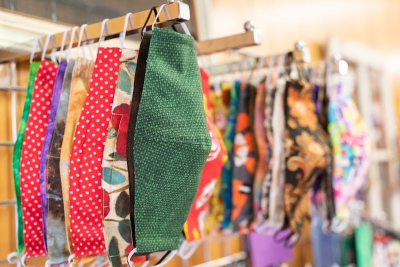 The image showcases a vibrant display of handmade fabric masks hanging on a rack in Sue's Ultimate Embroidery store.