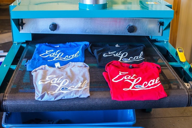 The image shows a heat press machine at All Seasons Custom Apparel, featuring four colorful t-shirts with the phrase "Eat Local.