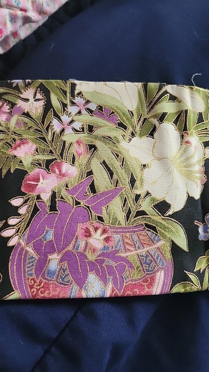 A vibrant fabric featuring a floral design with orchids and a decorative pot is prominently displayed.