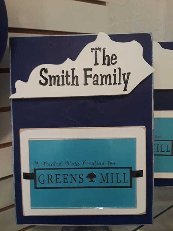 The image features a decorative sign displaying "The Smith Family" alongside a blue plaque that reads "A Painted Priss Creation for Greens Mill.