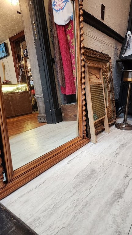 The image shows a cozy sewing store interior featuring a large ornate mirror and wooden flooring.