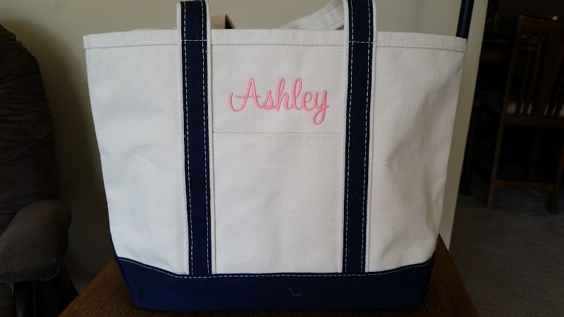 A personalized tote bag with the name "Ashley" embroidered in pink is displayed prominently.