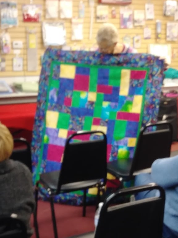 A woman holds up a colorful quilt featuring vibrant squares in a sewing store.