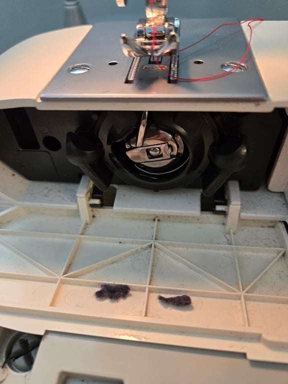 The image shows the interior of a sewing machine, highlighting the needle and bobbin area with red thread visible.