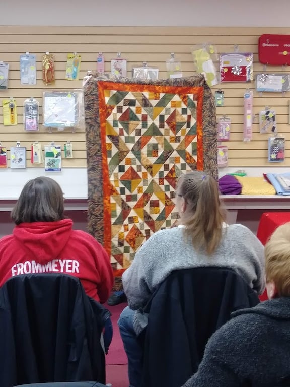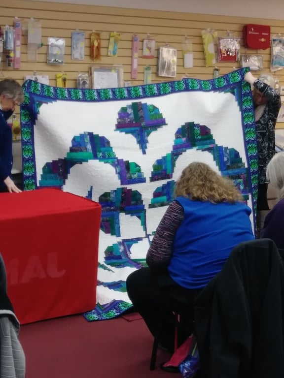 Two women hold up a colorful quilt featuring intricate patterns in a sewing store. A seated participant observes the demonstration, surrounded by shelves of sewing supplies.