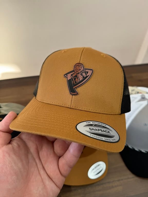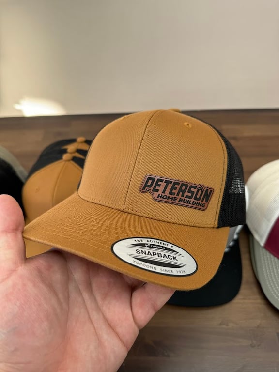 A person holds a brown snapback hat featuring the "Peterson Home Building" logo.