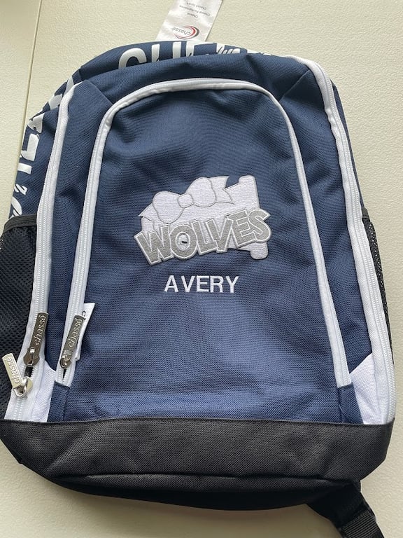 A navy blue backpack features an embroidered "Wolves" logo and the name "Avery." The design highlights custom embroidery options available at Cincy Stitches, a sewing store.