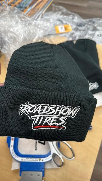 The image features a close-up of a black beanie hat embroidered with the "ROADSHOW TIRES" logo.