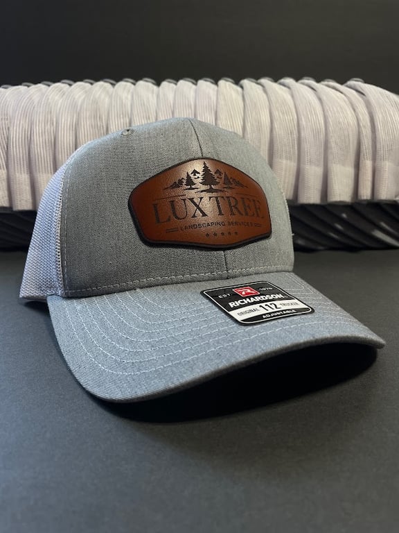 A gray cap with a leather patch featuring "LUX TREE Landscaping Services" is displayed prominently against a dark background.