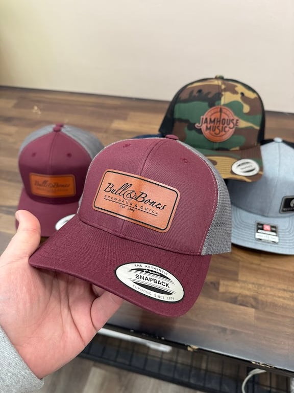 A person holds a maroon snapback hat with a leather patch in a sewing store. Various hats are displayed on a wooden surface, showcasing the store's embroidery offerings.