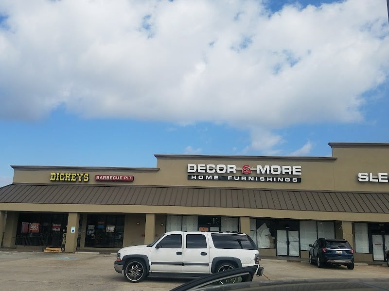 The image shows a storefront with a sign for "Decor & More Home Furnishings" alongside a barbecue restaurant.