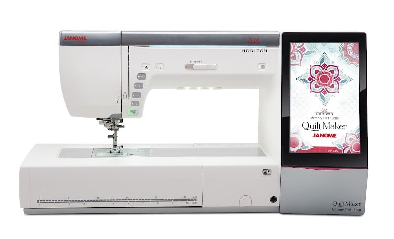 The image features a Janome Horizon Memory Craft 15000 sewing machine, showcasing its sleek design and digital interface.