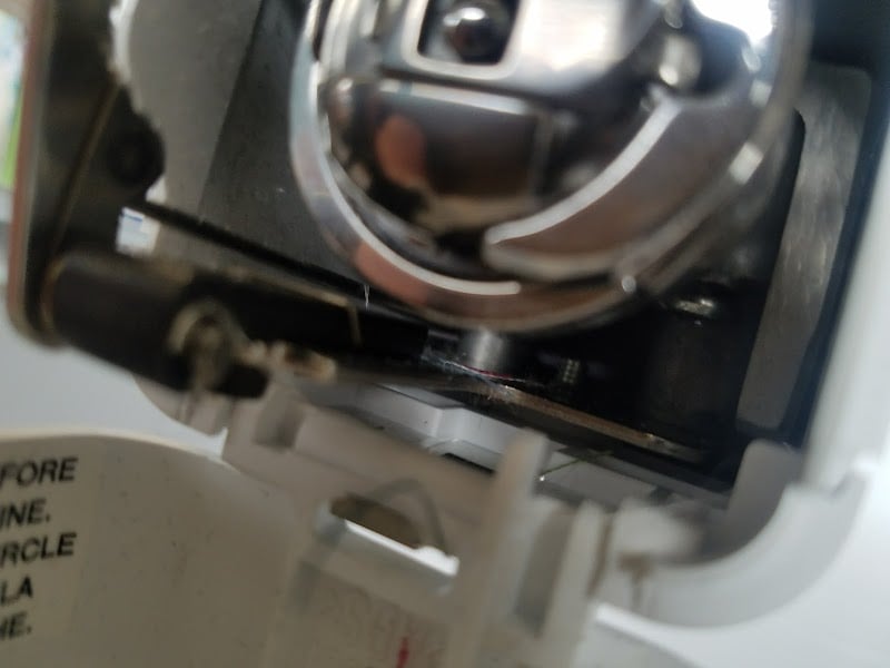 The image shows the interior mechanism of a sewing machine, highlighting its metal components and threading area.