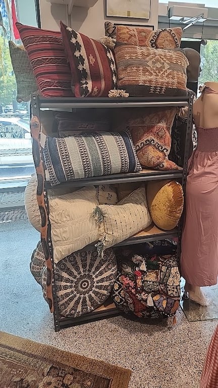 The image showcases a display of colorful, patterned pillows and cushions stacked on a metal shelf in a sewing store.