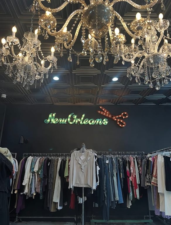 The image showcases the interior of ricRACK, a sewing store, featuring elegant chandeliers and a vibrant "New Orleans" sign.