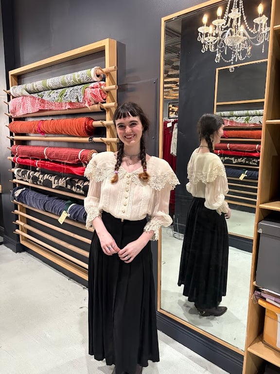 A smiling young woman with braided hair stands in a sewing store, ricRACK, in front of colorful fabric rolls displayed on wooden shelves.