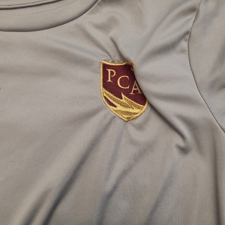 The image features a close-up of a gray shirt showcasing an embroidered crest with the letters "PCA" in maroon and gold.