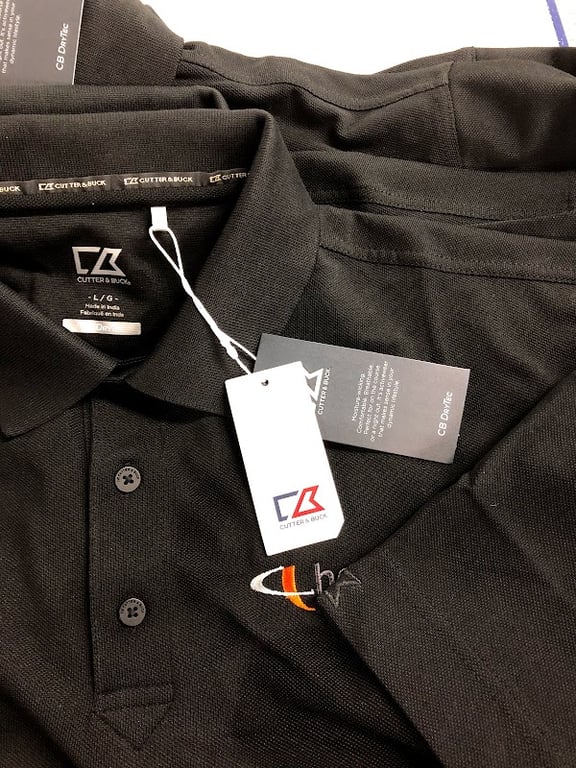This image features several black polo shirts from Cutter & Buck, showcasing their tags and logo. The shirts are neatly arranged, highlighting their quality fabric and design.