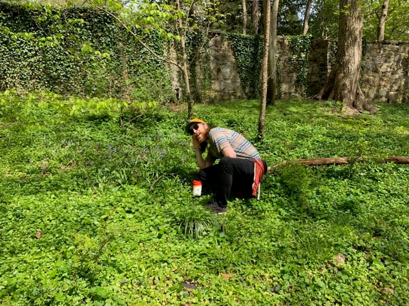 The image shows a man crouching in a lush green area surrounded by trees and a stone wall.