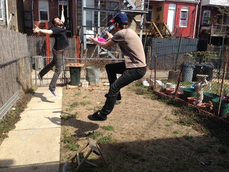 The image shows two men jumping in a backyard, with one appearing to throw a pink object.