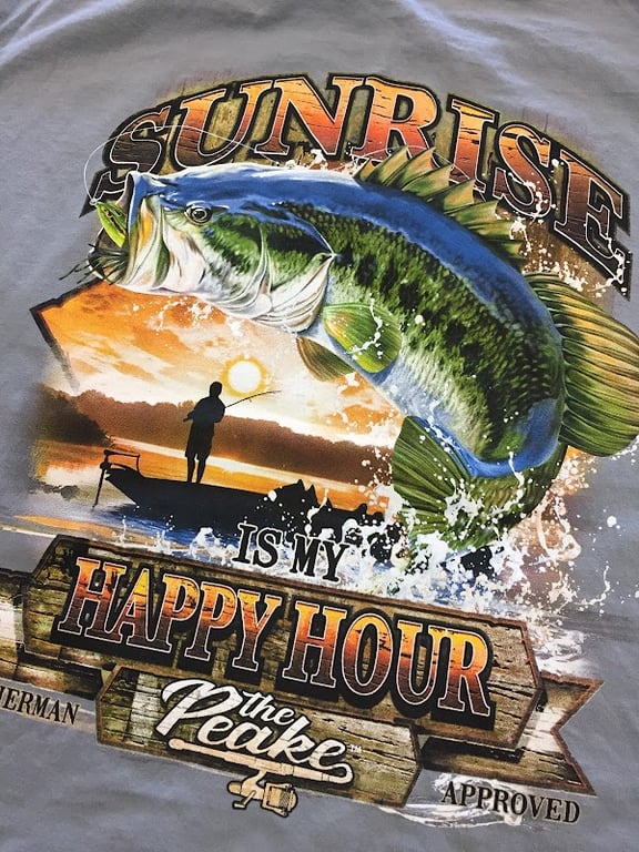 The image features a vibrant graphic t-shirt design showcasing a large bass fish leaping from water, with a sunset and a fisherman silhouette in the background.