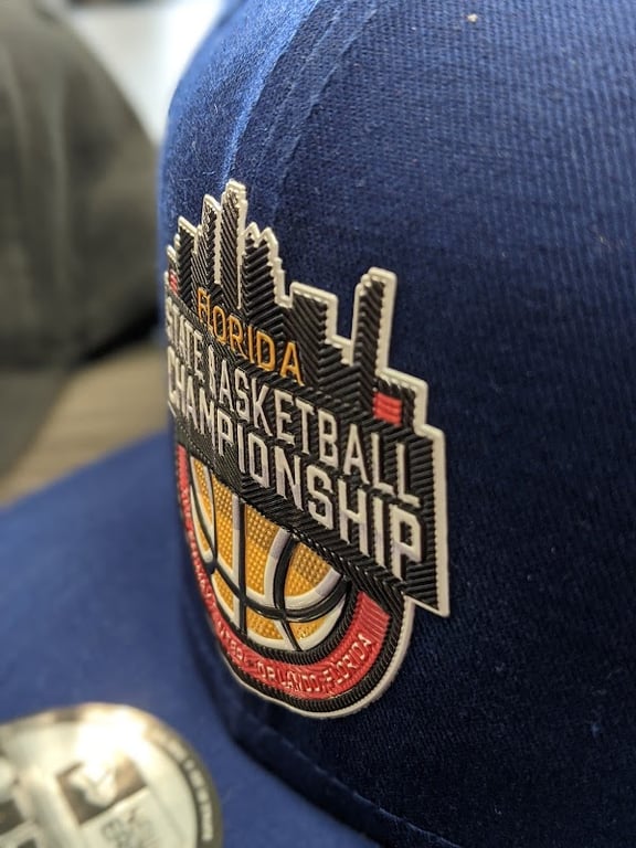 The image features a close-up of a blue cap adorned with an embroidered logo for the Florida State Basketball Championship.