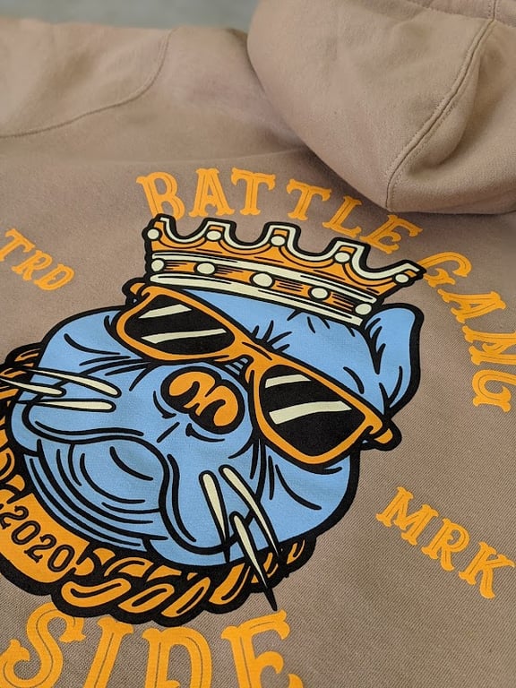 The image features a close-up of a beige hoodie showcasing a vibrant graphic of a cartoon pig wearing sunglasses and a crown.