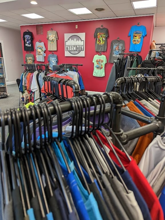 The image showcases the interior of Charm City Screen Print, featuring colorful t-shirts displayed on racks.