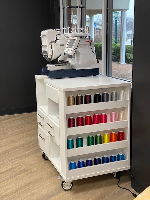 The image shows a modern sewing machine on a mobile cart, surrounded by vibrant spools of thread in various colors.