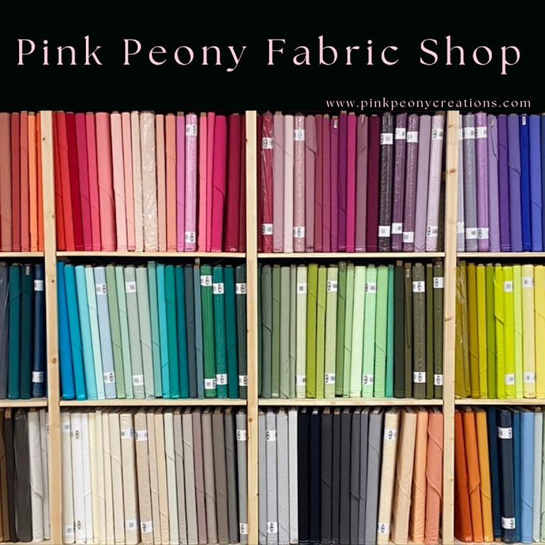 The image showcases a vibrant display of neatly arranged fabric bolts in various colors at Pink Peony Fabric Shop.