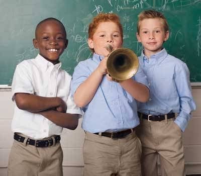 The image shows three boys in light blue shirts and khaki pants, standing in front of a chalkboard. One boy is playing a trumpet, while the others smile and pose.