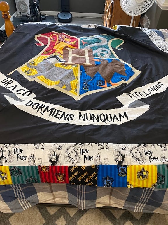 A colorful quilt featuring the Hogwarts crest and Harry Potter-themed fabrics is displayed on a bed.